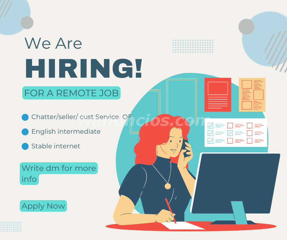 Estamos contratando chatter/ atencion cliente para Trabajar en Remoto, gestionando alto volumen de chats y promocionando las suscripciones a la plataforma para ventas.
